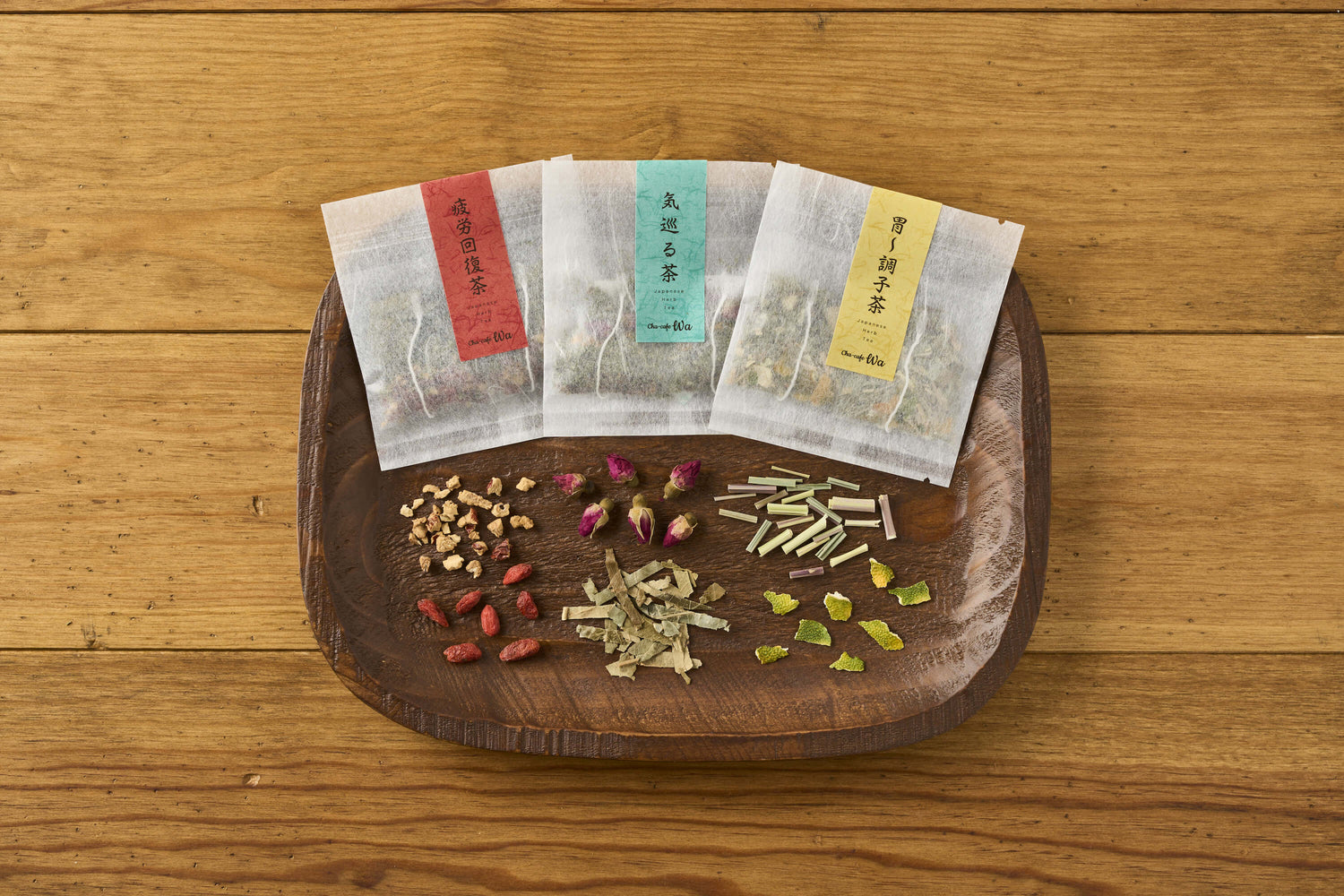 茶カフェ「わ」のオリジナルブレンド漢方茶の名前には、材料を選び、調合するときに、どのようなお客様にお届けしたいか、という漢方ブレンダーの思いが込められています。ティーバッグひとつひとつに、丁寧に詰めました。薬膳カレーや薬膳粥がおいしいと評判の京町家カフェから、直接お送りいたします。